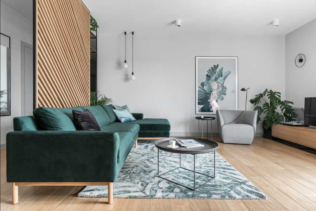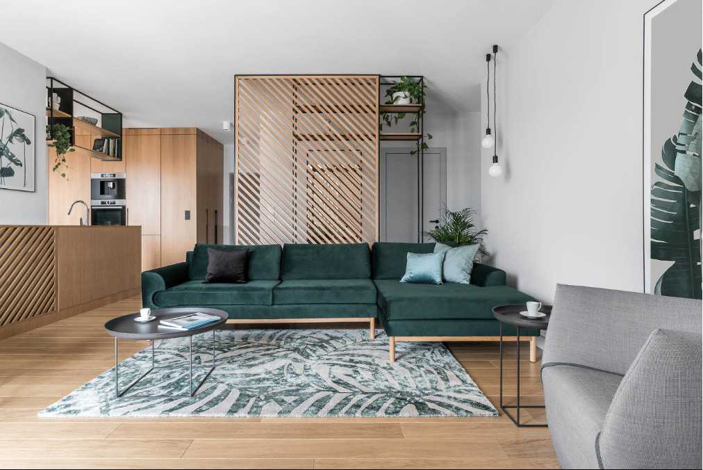 ▲在室內(nèi)的任一處,都可以感受到設(shè)計(jì)師安排下的自然氣息,淺色的木質(zhì)地板,森林綠色的天鵝絨沙發(fā),甚至是植物的樹葉也被應(yīng)用于墻面上的裝飾畫或是地面的地毯。