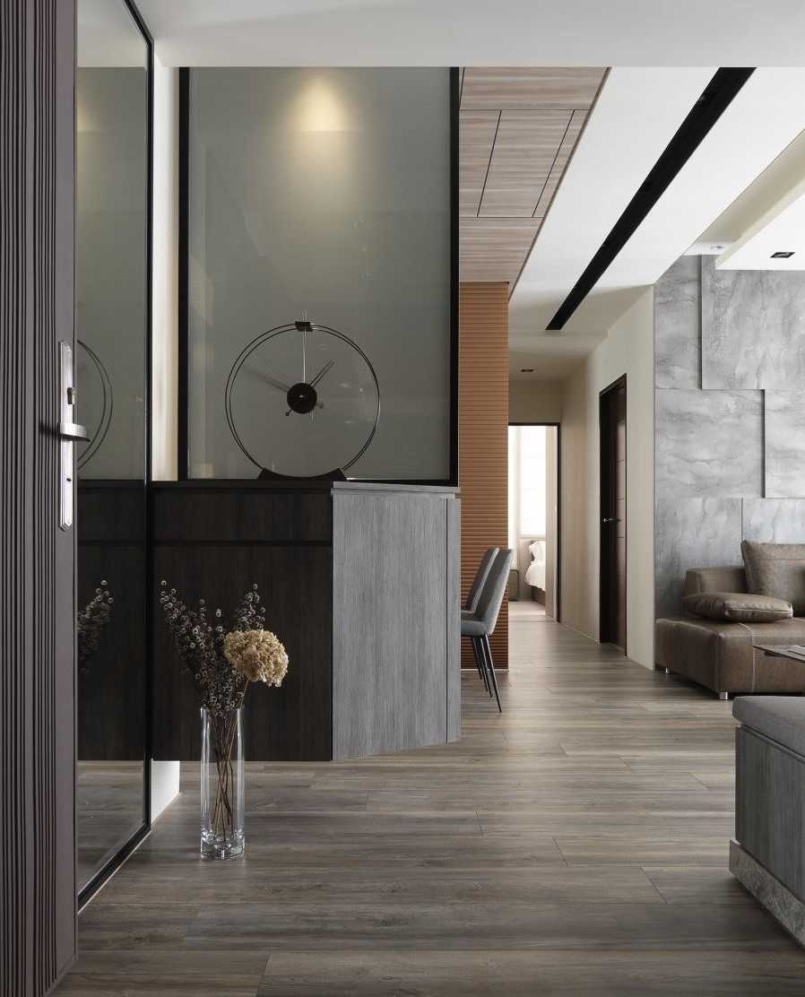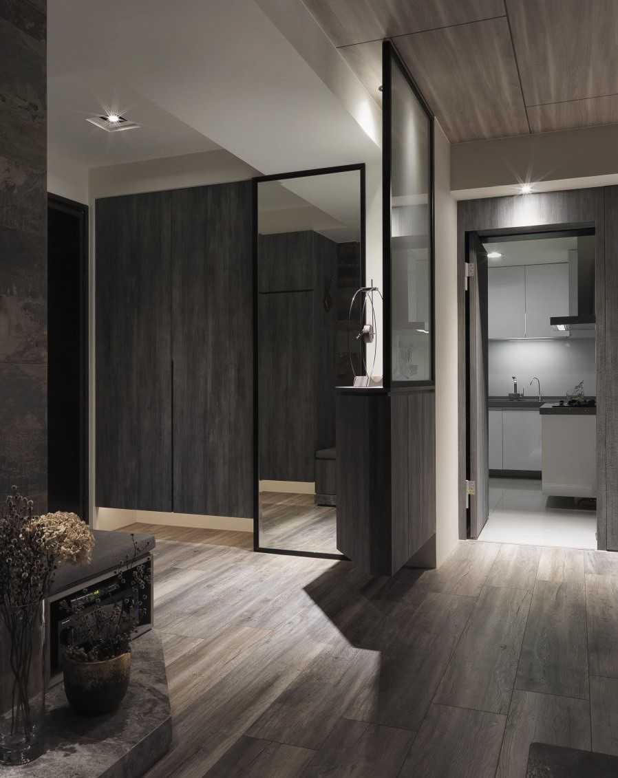 玄關(guān)處屏風(fēng)與墻面轉(zhuǎn)角空間打造的懸柜,增加收納機(jī)能同時(shí)作為藝術(shù)質(zhì)感端景。