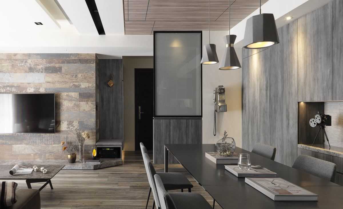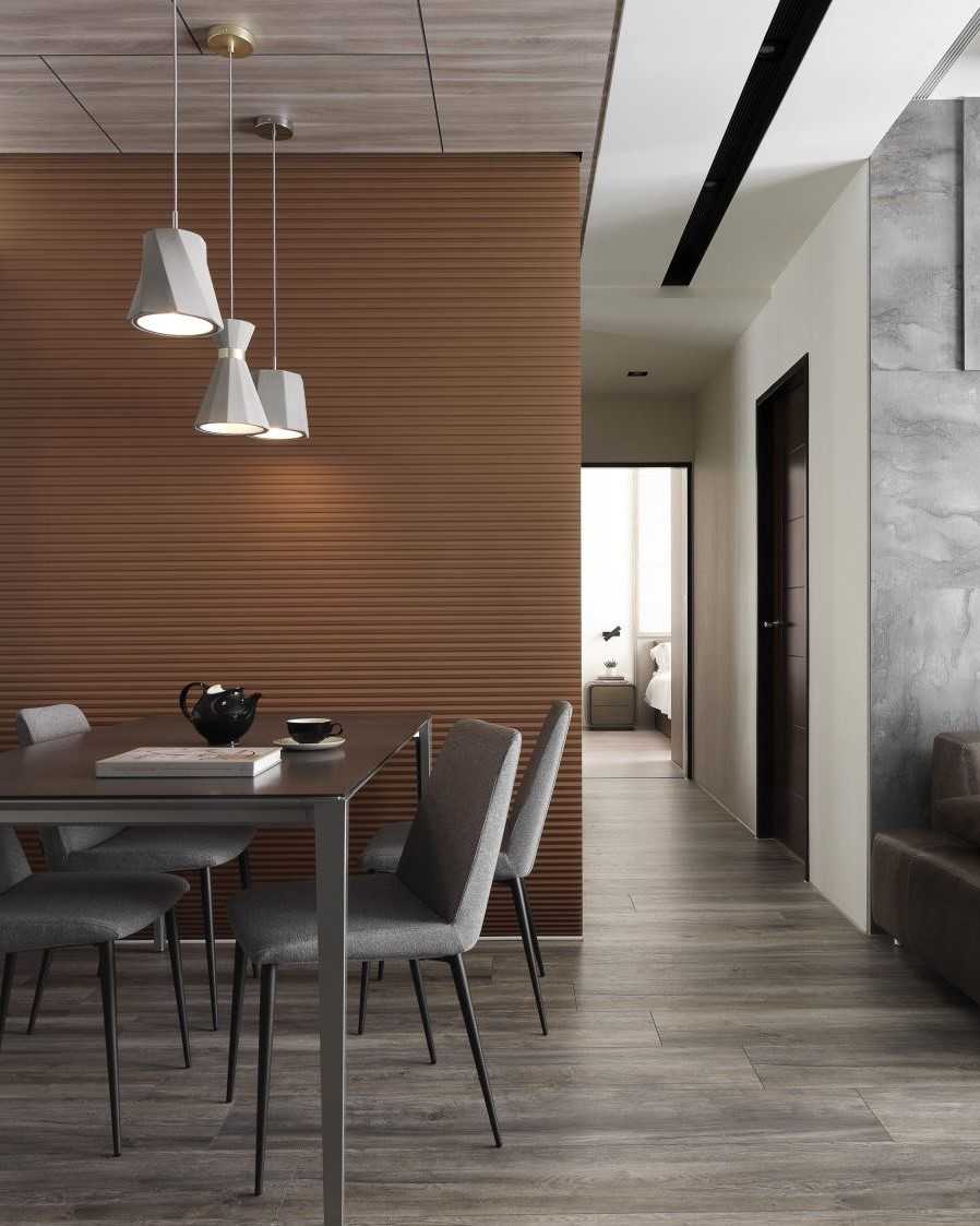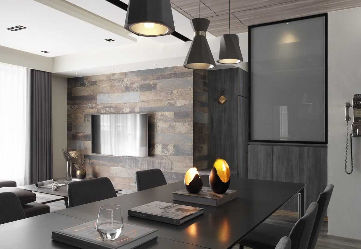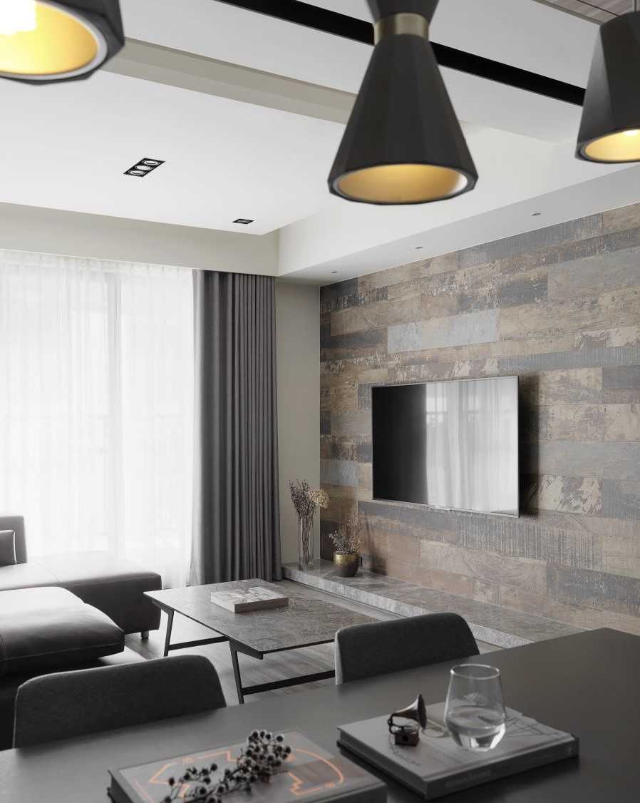 公領(lǐng)域地坪的仿舊木紋磚、復(fù)古味十足的電視墻以及深灰質(zhì)感的特殊立面質(zhì)材,讓同色系的視覺(jué)空間堆疊出細(xì)節(jié)層次,而幾盞有暖度的黃光特色燈具,加乘了居家生活氛圍與特色。