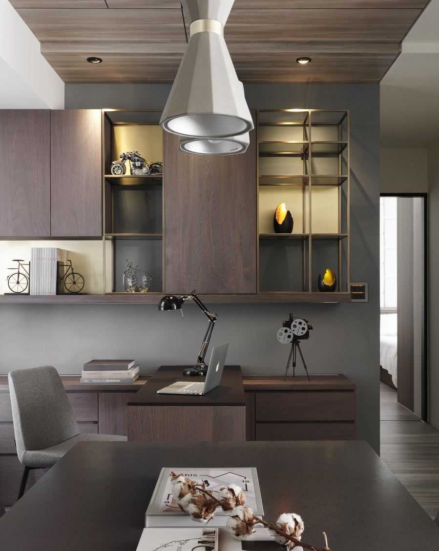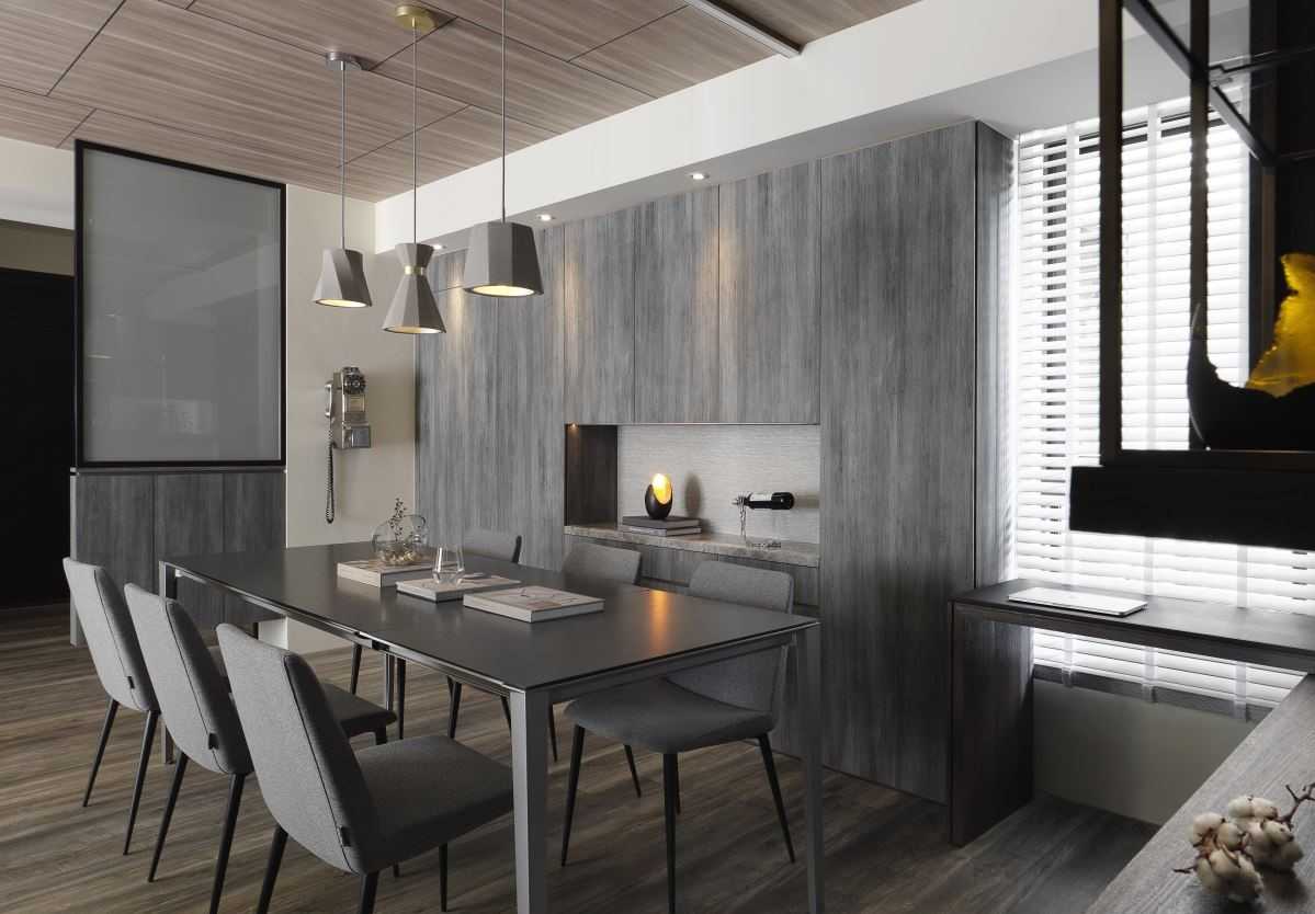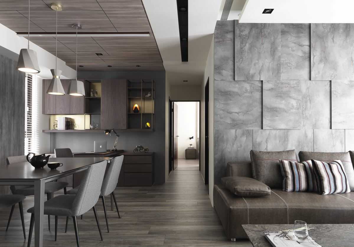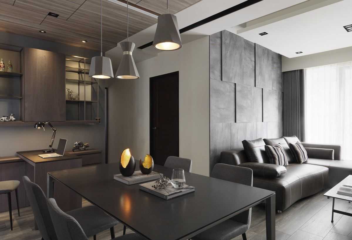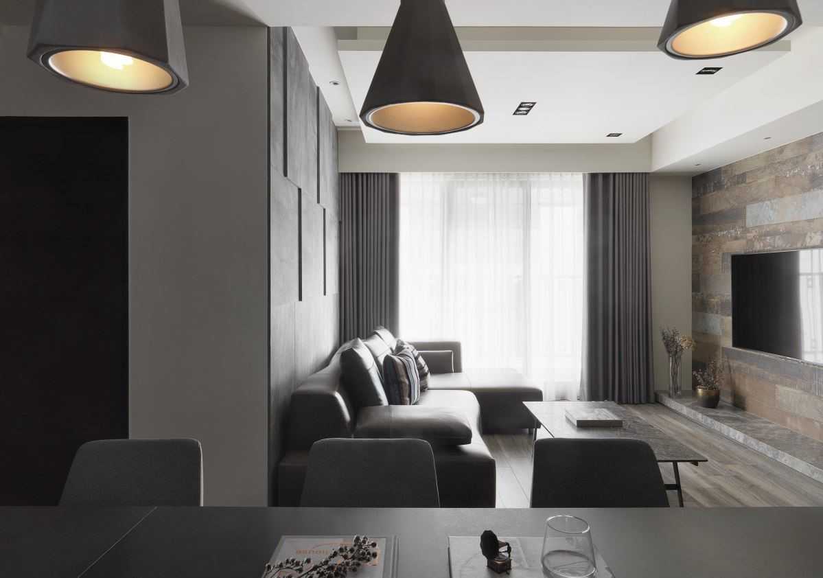 公領(lǐng)域地坪的仿舊木紋磚、復(fù)古味十足的電視墻以及深灰質(zhì)感的特殊立面質(zhì)材,讓同色系的視覺(jué)空間堆疊出細(xì)節(jié)層次,而幾盞有暖度的黃光特色燈具,加乘了居家生活氛圍與特色。