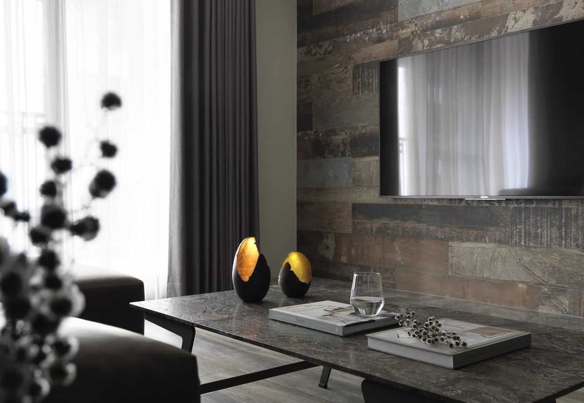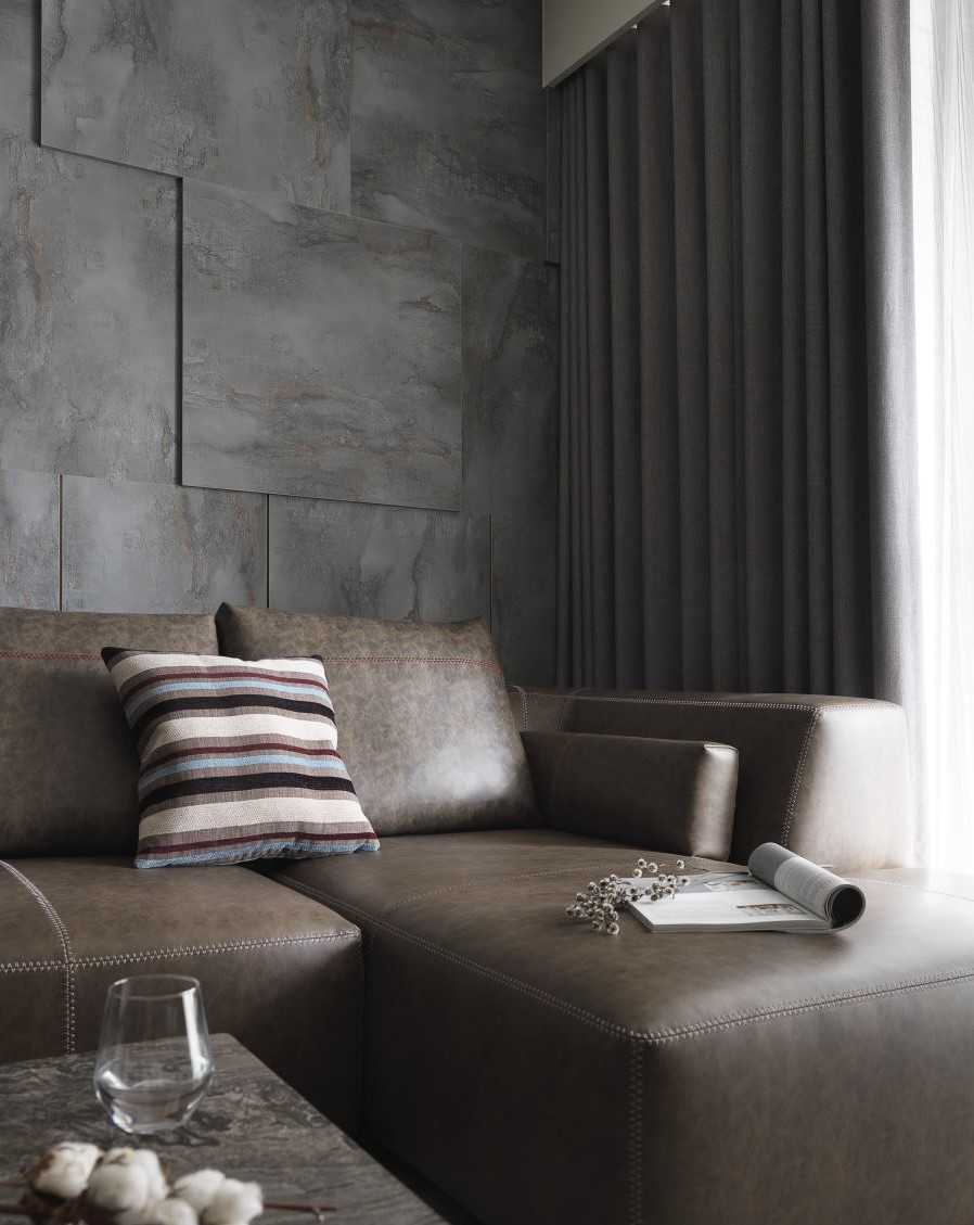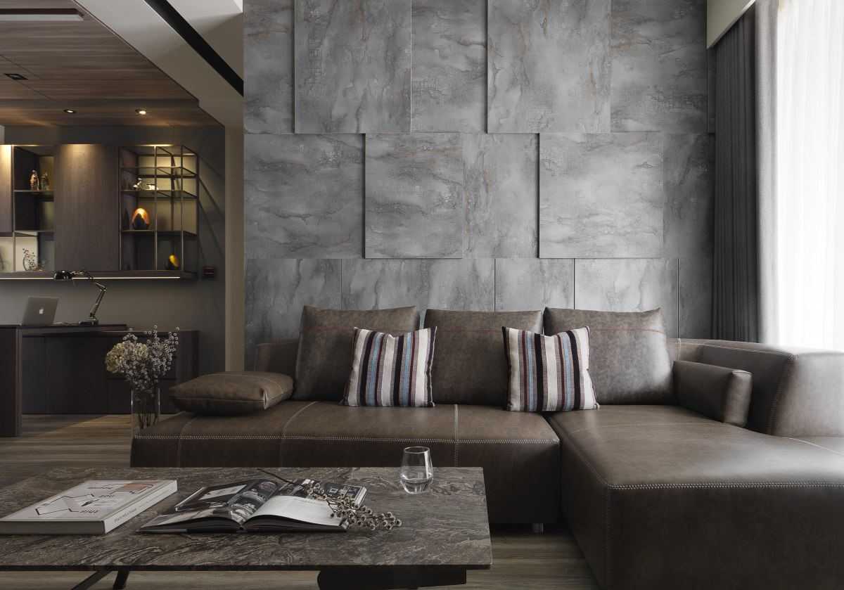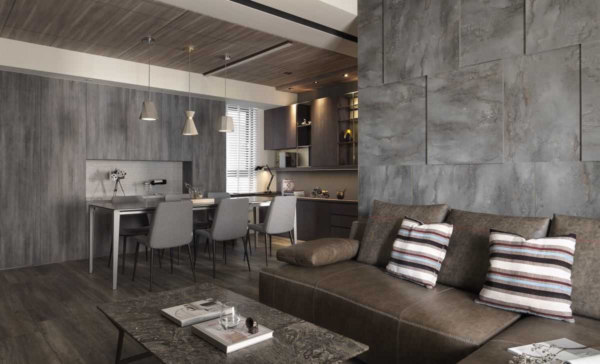 公領(lǐng)域地坪的仿舊木紋磚、復(fù)古味十足的電視墻以及深灰質(zhì)感的特殊立面質(zhì)材,讓同色系的視覺(jué)空間堆疊出細(xì)節(jié)層次,而幾盞有暖度的黃光特色燈具,加乘了居家生活氛圍與特色。
