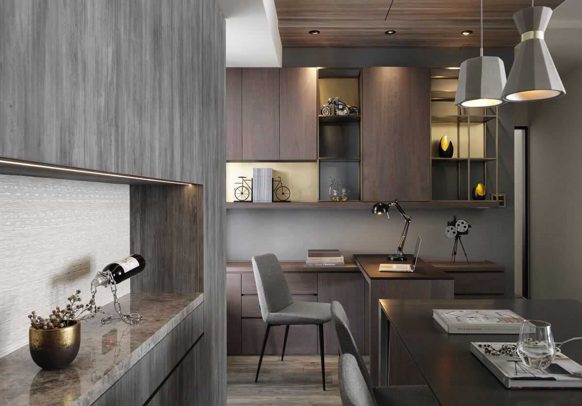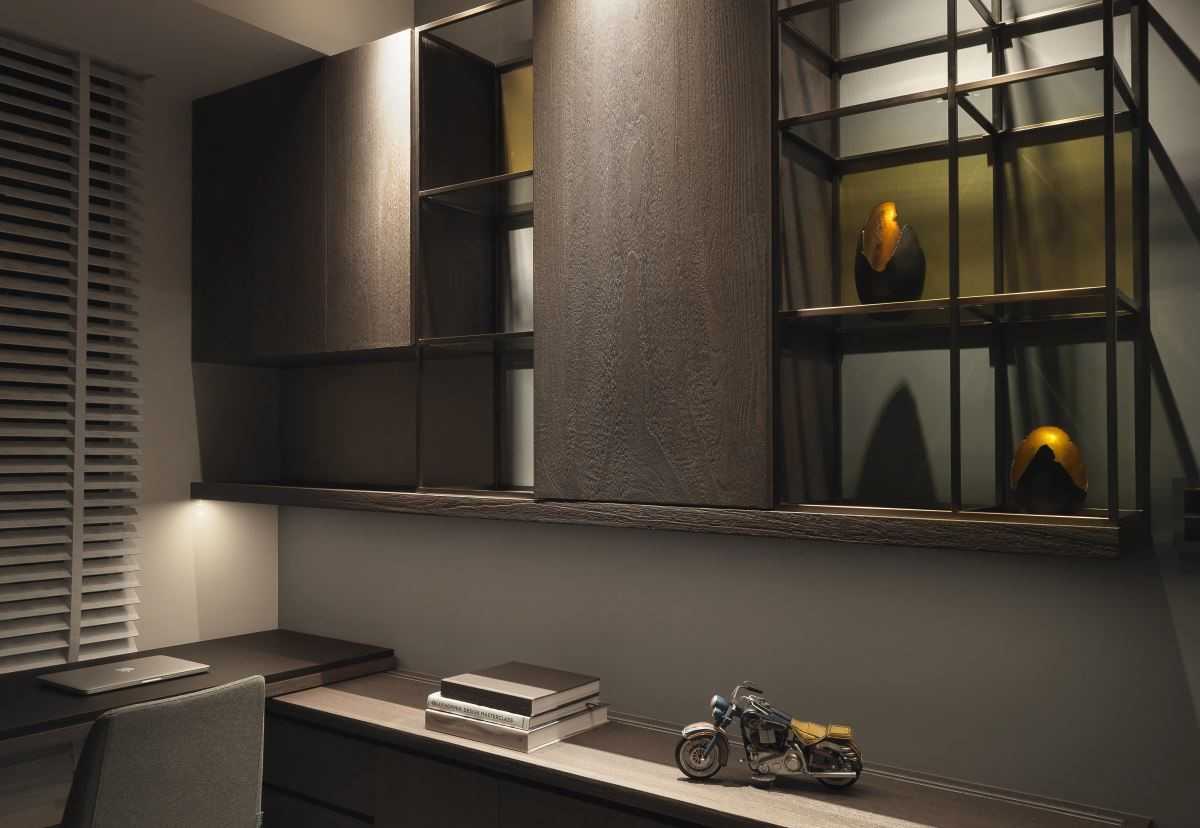 公領(lǐng)域依據(jù)屋主生活習(xí)慣,增設(shè)一開(kāi)放式書(shū)房,平行餐桌的鋪排讓視線及生活動(dòng)線更加利落、順暢,在餐桌與書(shū)房區(qū)之間設(shè)計(jì)的活動(dòng)式幕簾,讓開(kāi)放式書(shū)房也能享有與世隔絕的專心氛圍。
