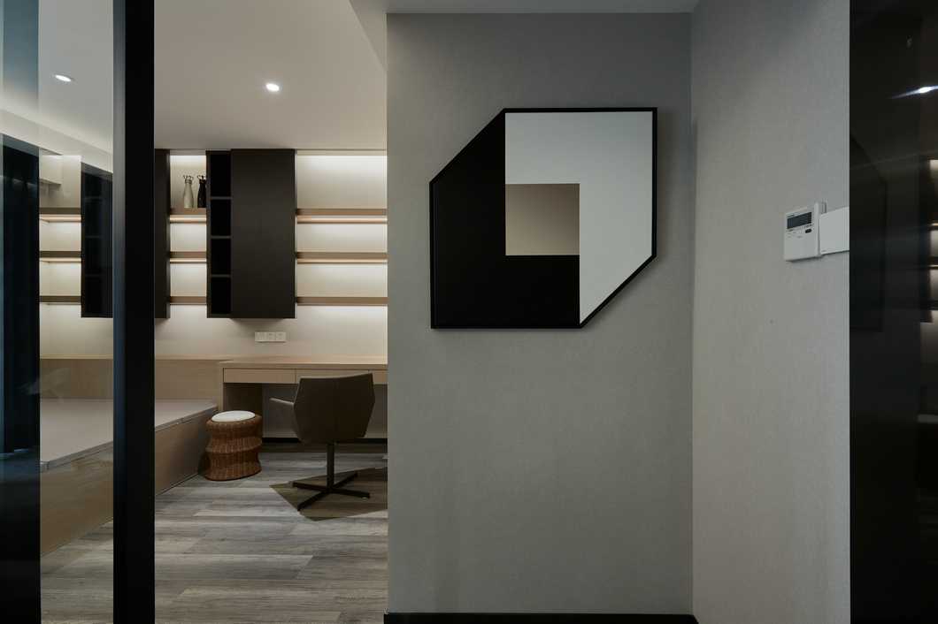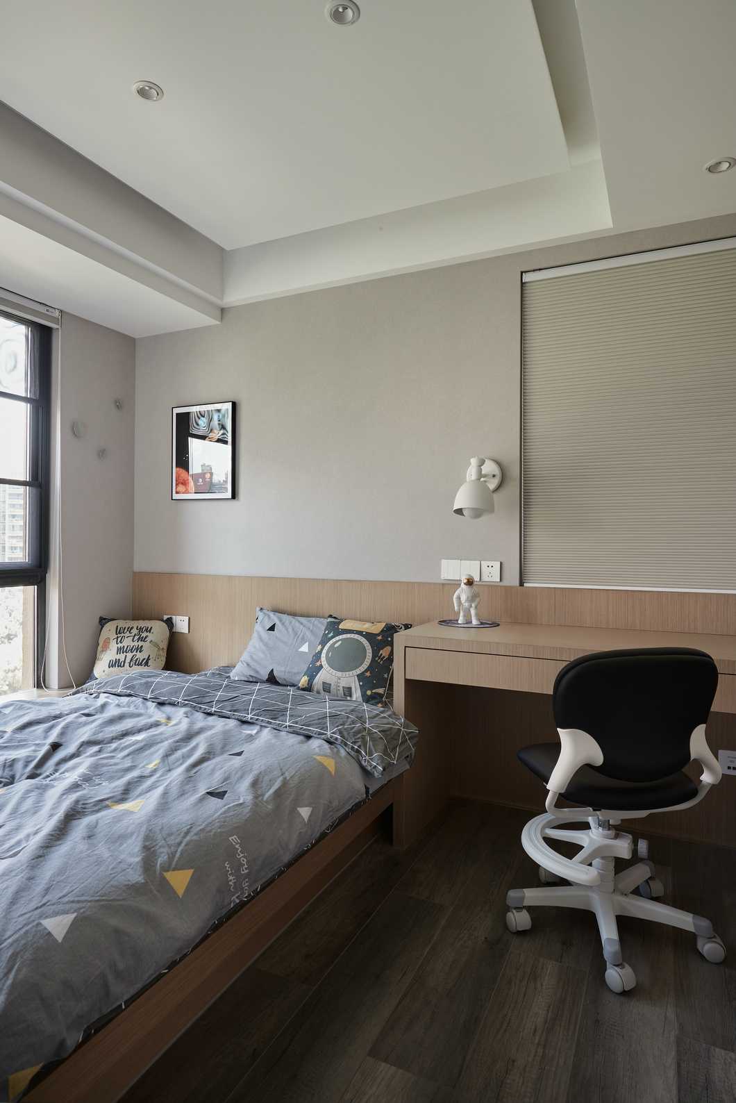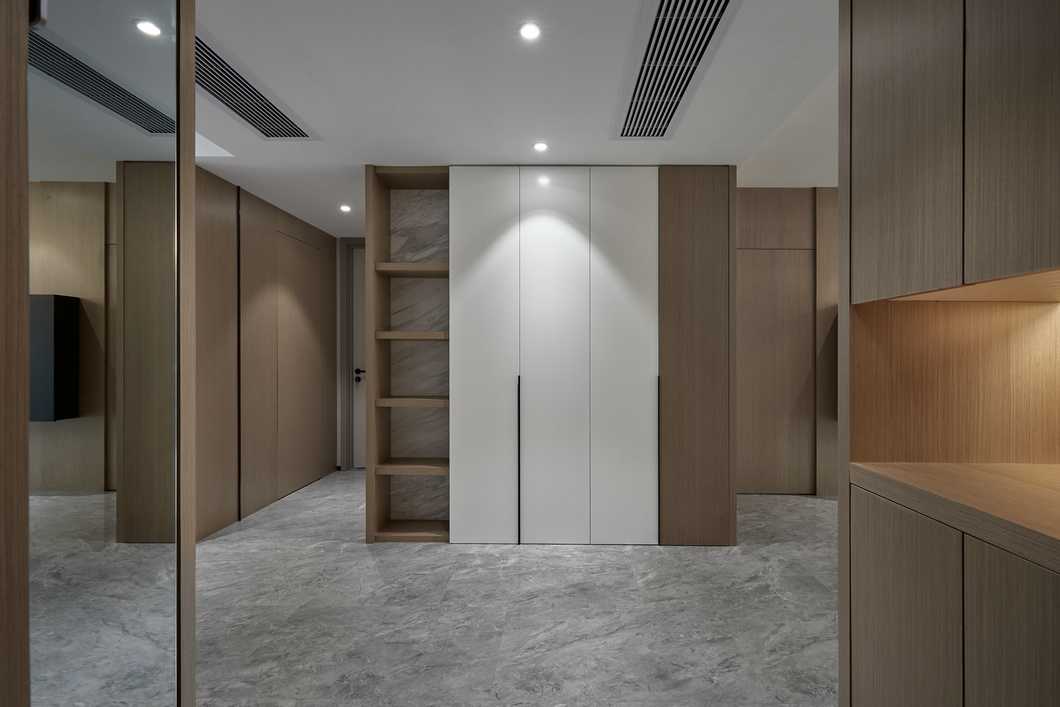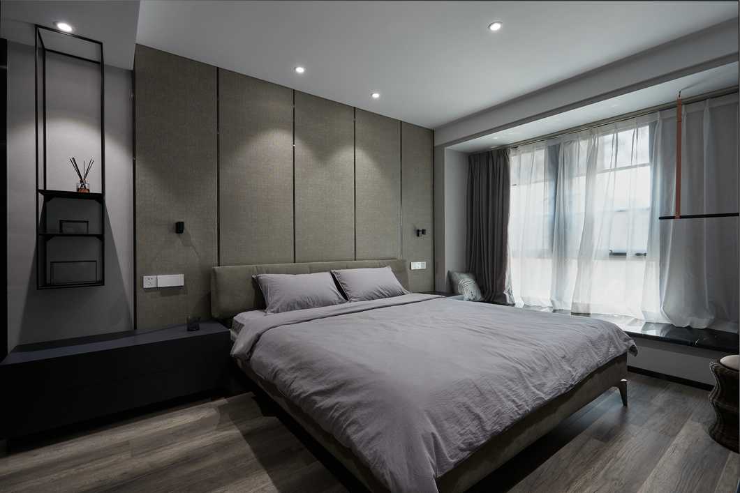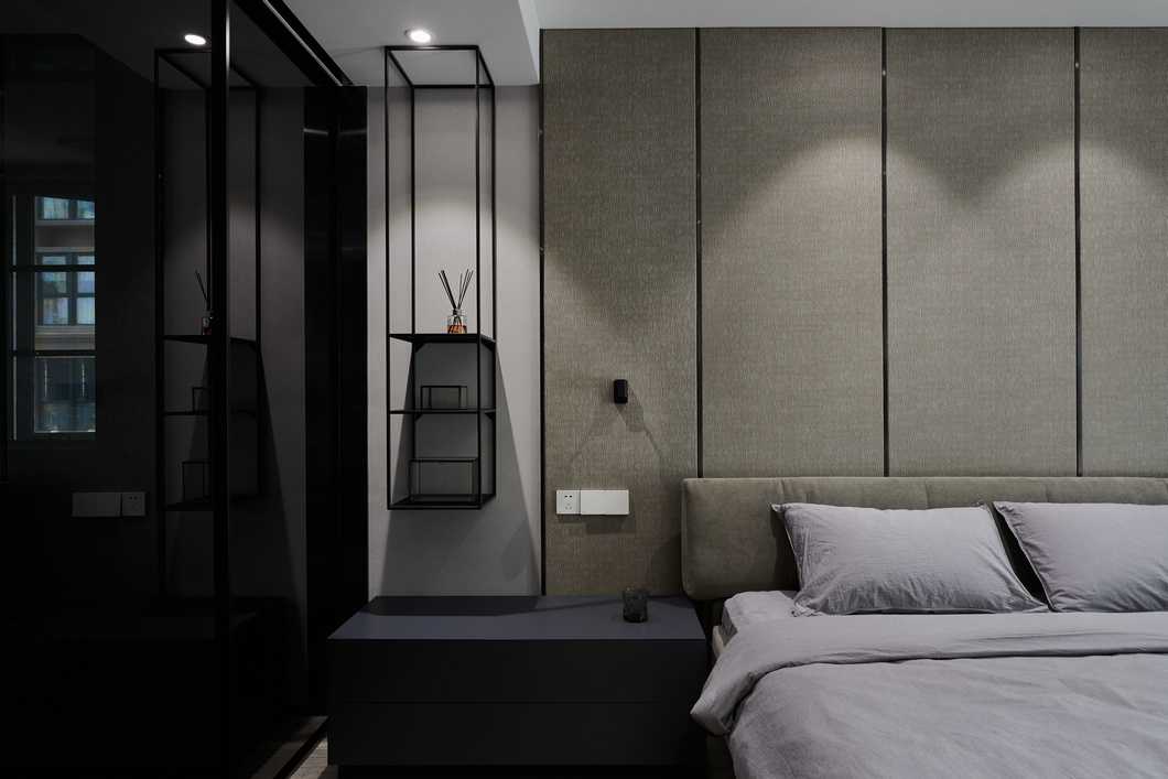 主臥的色調(diào)略顯深邃,灰色的墻紙與深色家具靜謐感十足。公區(qū)的縱向線條感被換了形式的引入進來,設(shè)計思路貫穿其中。