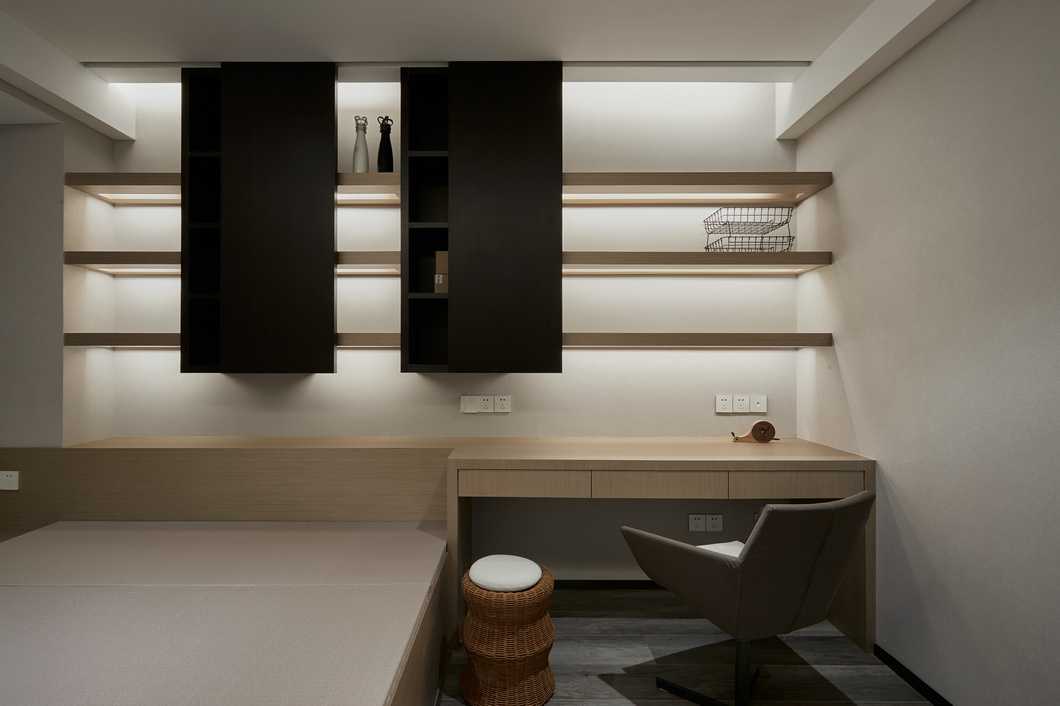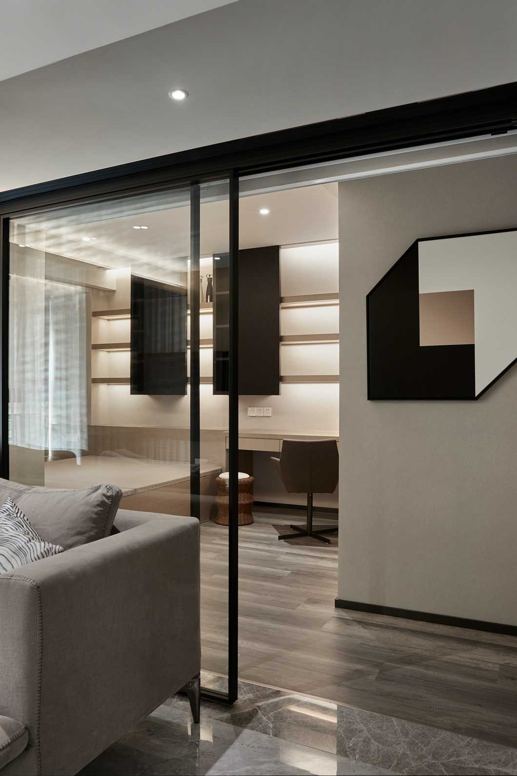書房于客廳僅一扇移門為界,通透的玻璃讓兩個空間保持獨立的同時增加了許多互動感,釋放了空間的可能性